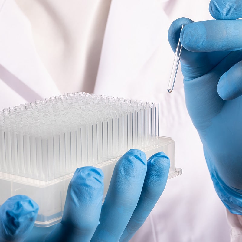 96-well glass tube plate for pure, mid-volume sample handling. Ideal for assays and solvent use.